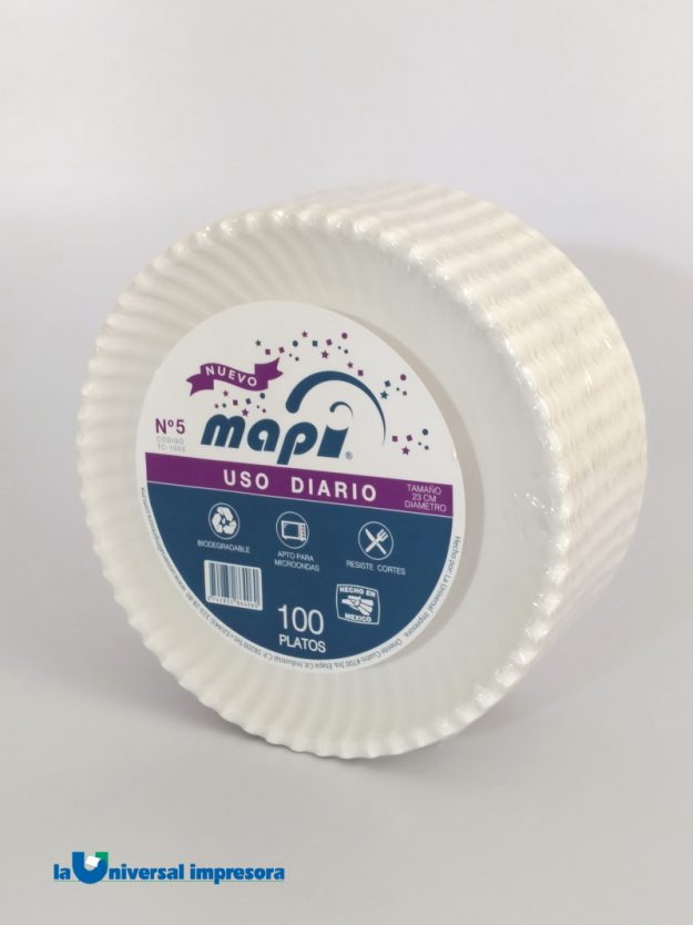 PLATO REDONDO No. 5 TC-1005 USO DIARIO Plato de papel para uso diario. En presentación de 23cm. Se vende por cajas de 1,000 unidades – 10 paquetes de 100 platos c/u Precio $